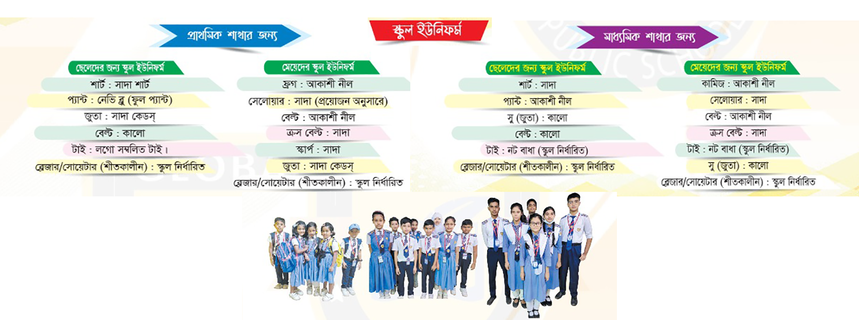 গ্লোবাল পাবলিক স্কুলের রয়েছে নিজস্ব স্কুল ড্রেস। যা অন্যান্য সকল স্কুল থেকে আপনার সন্তানকে করবে রুচিশীল এবং আধুনিক। আকাশী জামা, সাদা সেলোয়ার, সাদা শার্ট, নেভিব্লু প্যান্ট এবং আকর্ষনীয় শোল্ডার, টাই এবং স্কুল থেকে প্রদান করা আইডি কার্ডে শ্রেণিভেদে সাদা কেডস্ এবং কালো সু পরিহিত শিক্ষার্থীদের করে তোলে স্মার্ট ও রুচিশীল।